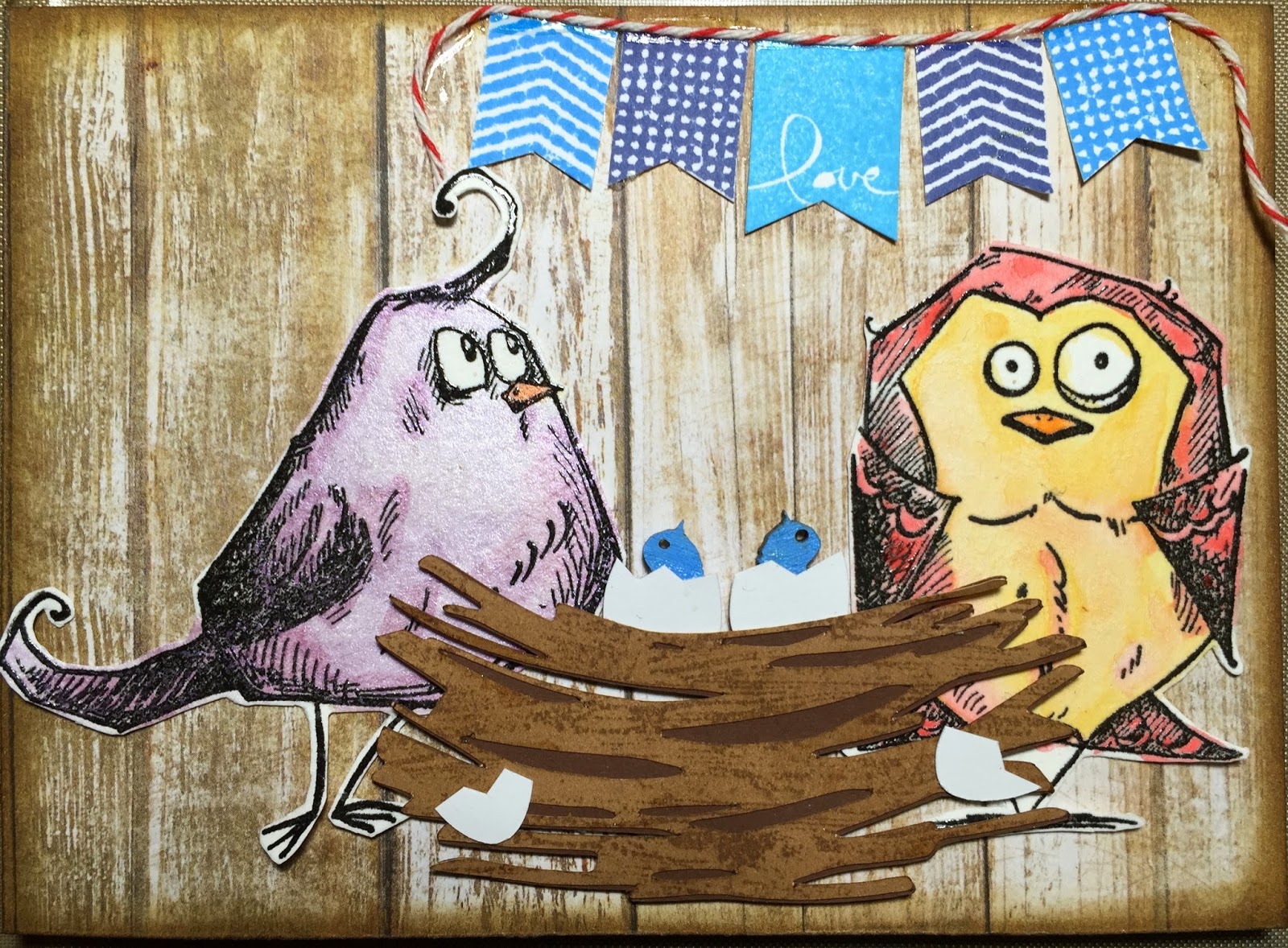 I stamped and heat embossed the birds onto watercolor paper and painted with watercolors, cut them out and placed on the woodgrain background. I cut the nest out with my Silhouette, cut out a backing piece, and stamped woodgrain with distress ink. I took the eggs from the cut file and cut the jagged cracked open lines with a pair of scissors. I painted the wooden birds with distress paint and placed them behind the egg pieces still in the nest while placing the broken tops outside the nest. Add a little banner and you have a cute card.